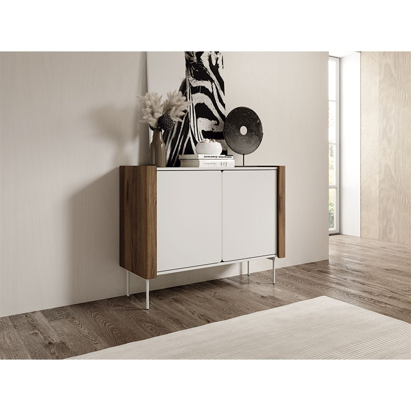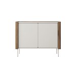 Aparador de 2 portas, e prateleiras no interior, com um design limpo e sem puxadores visíveis. Material de fabrico do móvel: Corpo – aglomerado laminado com 16 mm de espessura, orla ABS de 0,5 mm. Portas – aglomerado laminado com 16 mm de espessura, orla ABS de 0,5 mm, laterais em MDF com 18 mm de espessura e acabamento em nogueira. Pés metálicos na cor caxemira. Dobradiças com função de soft close. Prateleiras interiores funcionais – oferecem muito espaço de arrumação.
