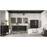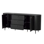 Aparador composto por 2 portas e 3 amplas gavetas, oferece amplo espaço para armazenar utensílios e objetos decorativos, mantendo seu espaço sempre organizado. Além disso, conta com duas prateleiras, ideais para os seus objetos decorativos ou livros, permitindo um toque pessoal à sua decoração. Os pés metálicos pretos, adornados com detalhes dourados, conferem um charme extra e garantem estabilidade ao móvel, enquanto os puxadores pretos com detalhes dourados acrescentam um toque de modernidade e requinte.