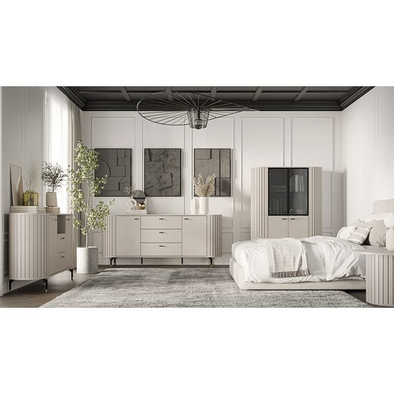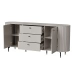 Aparador composto por 2 portas e 3 amplas gavetas, oferece amplo espaço para armazenar utensílios e objetos decorativos, mantendo seu espaço sempre organizado. Além disso, conta com duas prateleiras, ideais para os seus objetos decorativos ou livros, permitindo um toque pessoal à sua decoração. Os pés metálicos pretos, adornados com detalhes dourados, conferem um charme extra e garantem estabilidade ao móvel, enquanto os puxadores pretos com detalhes dourados acrescentam um toque de modernidade e requinte.
