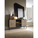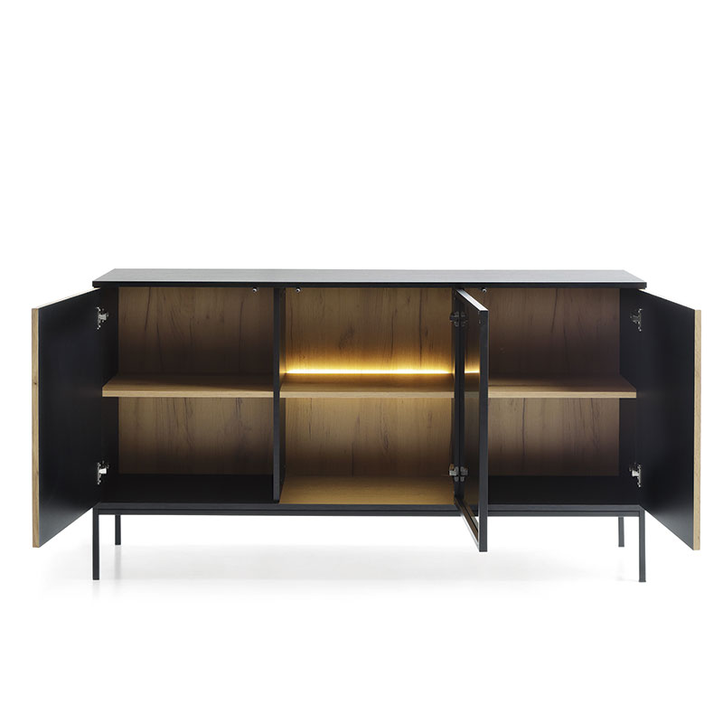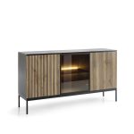 Aparador com 3 portas, uma delas de vidro. As frentes em fresado, com a sua tonalidade em Carvalho Wotan, trazem uma sensação de conforto e familiaridade, contrastando de forma encantadora com o tom escuro predominante. O vidro Antisol preto, com a sua transparência misteriosa e intrigante, acrescenta um toque de modernidade e sofisticação, ao mesmo tempo que proporciona uma leve camada de privacidade. Características: 3 portas com sistema de abertura push-to-open. Estrutura em aglomerado de madeira com acabamento melamínico Frentes em tom de madeira. Pés em metal preto. Interior com prateleiras para arrumação eficiente. LED incluído.