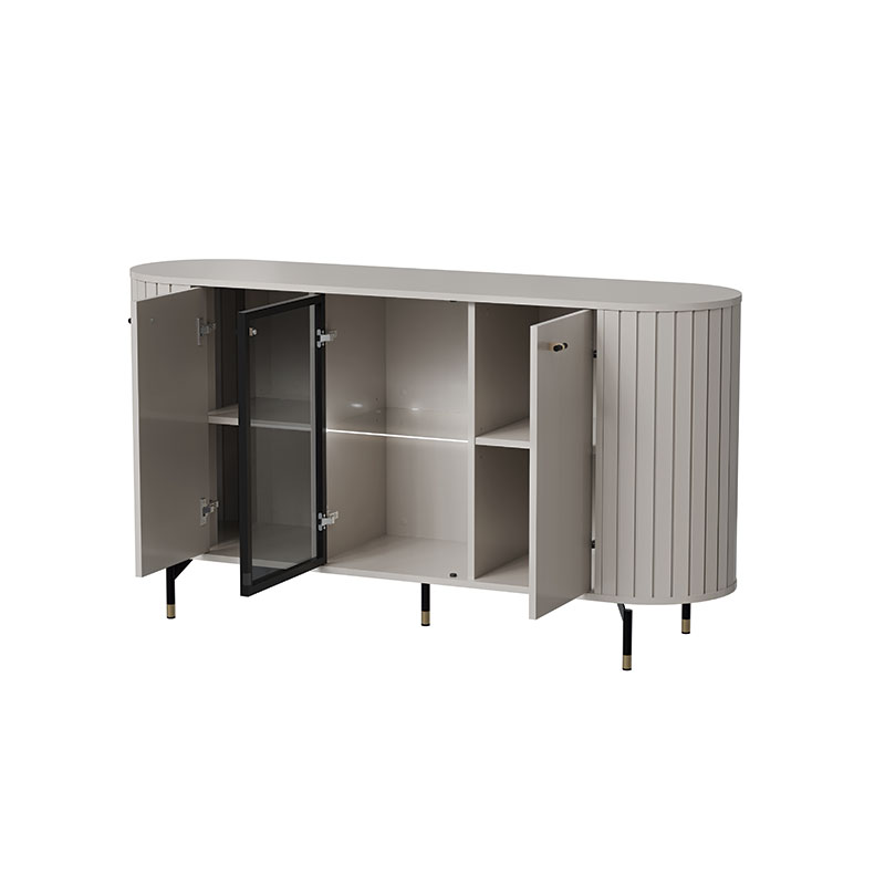 Aparador com 3 portas: a central em vidro, que confere um toque de leveza e modernidade, e duas portas adicionais em um acabamento elegante que complementa o visual. Os pés metálicos em preto trazem uma base robusta e estável, enquanto o detalhe em dourado acrescenta um toque de requinte e sofisticação.