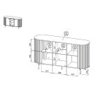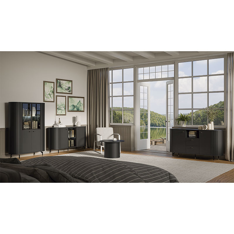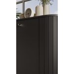 Aparador com 3 portas: a central em vidro, que confere um toque de leveza e modernidade, e duas portas adicionais em um acabamento elegante que complementa o visual. Os pés metálicos em preto trazem uma base robusta e estável, enquanto o detalhe em dourado acrescenta um toque de requinte e sofisticação.