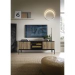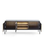 Base TV com 3 portas, uma delas de vidro. As frentes em fresado, com a sua tonalidade em Carvalho Wotan, trazem uma sensação de conforto e familiaridade, contrastando de forma encantadora com o tom escuro predominante. O vidro Antisol preto, com a sua transparência misteriosa e intrigante, acrescenta um toque de modernidade e sofisticação, ao mesmo tempo que proporciona uma leve camada de privacidade. Detalhes: Corpo: Placa de laminado de 16 mm. Frentes: Placa de MDF de 18 mm fresada com estrutura em tubo de alumínio quadrado. Orla em ABS. Sistema de abertura sem puxadores (push to open). Dobradiças HAFELE. Pés em estrutura de tubo de aço quadrado com acabamento preto mate. Vidro temperado. Iluminação LED incluída.