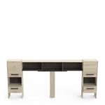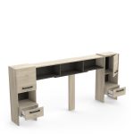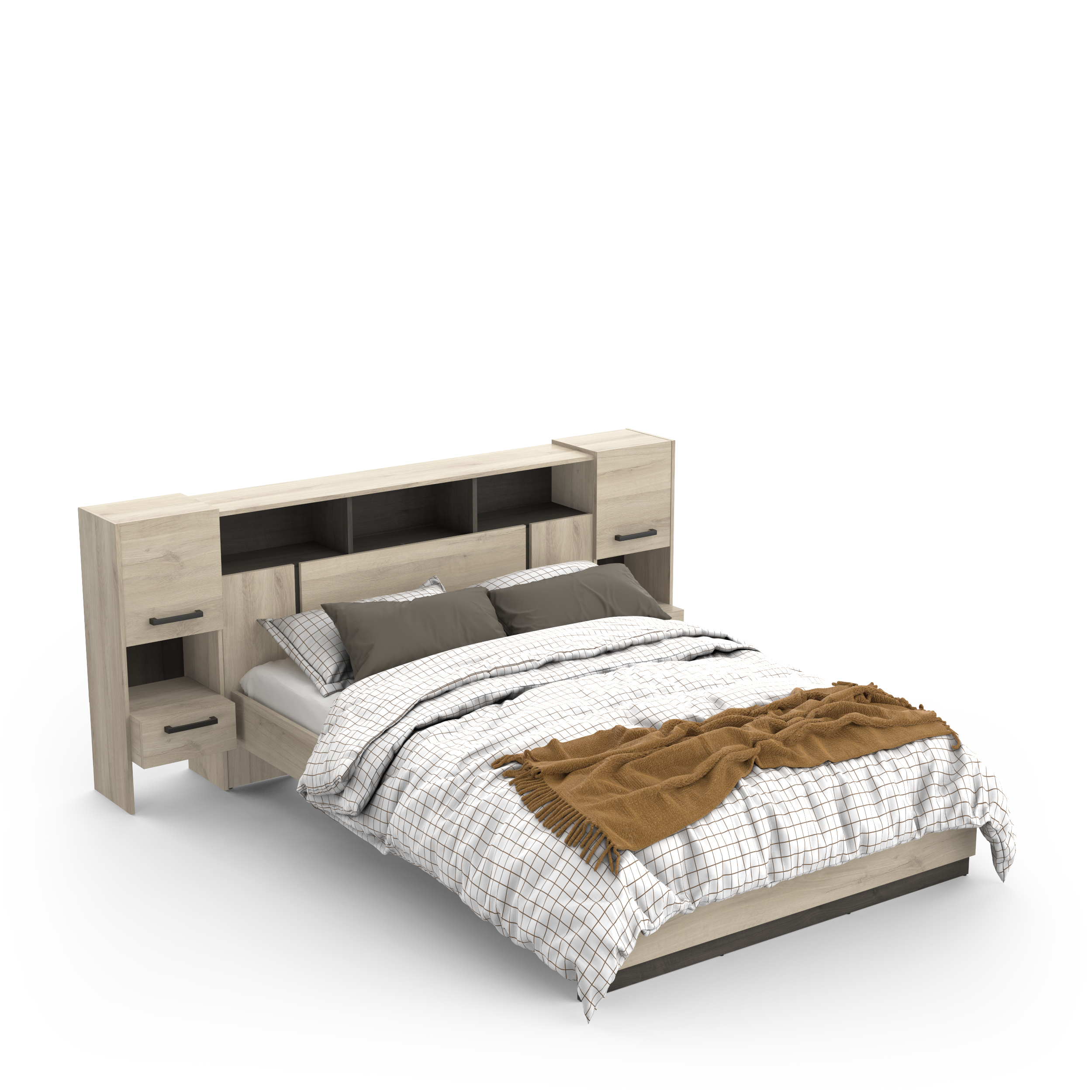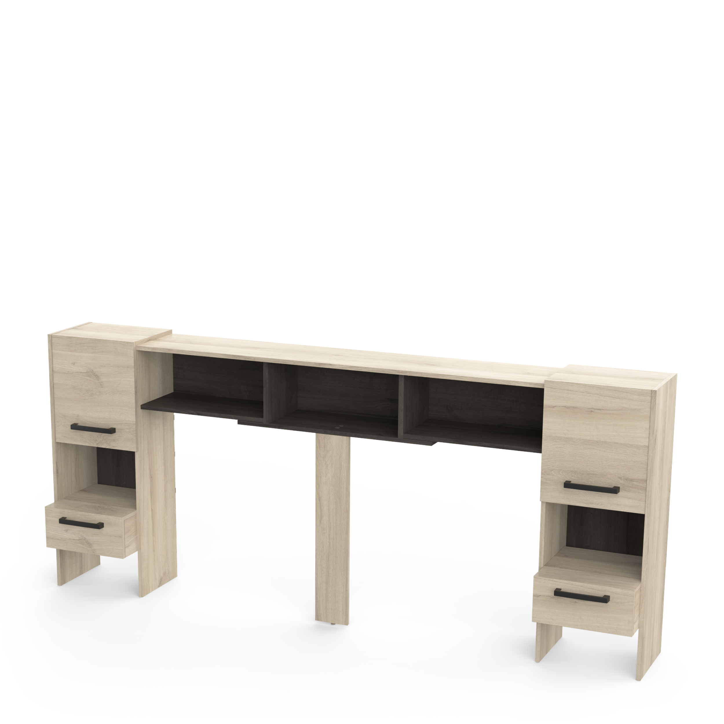 Cabeceira extensível com grande capacidade de arrumação modular: 5 nichos + 2 armários de cabeceira com gaveta e 2 portas. Compatível com camas de 135×190 cm, 140×190 cm e 160×200 cm. Detalhes: Puxador de plástico cinza. Material: Melamina.