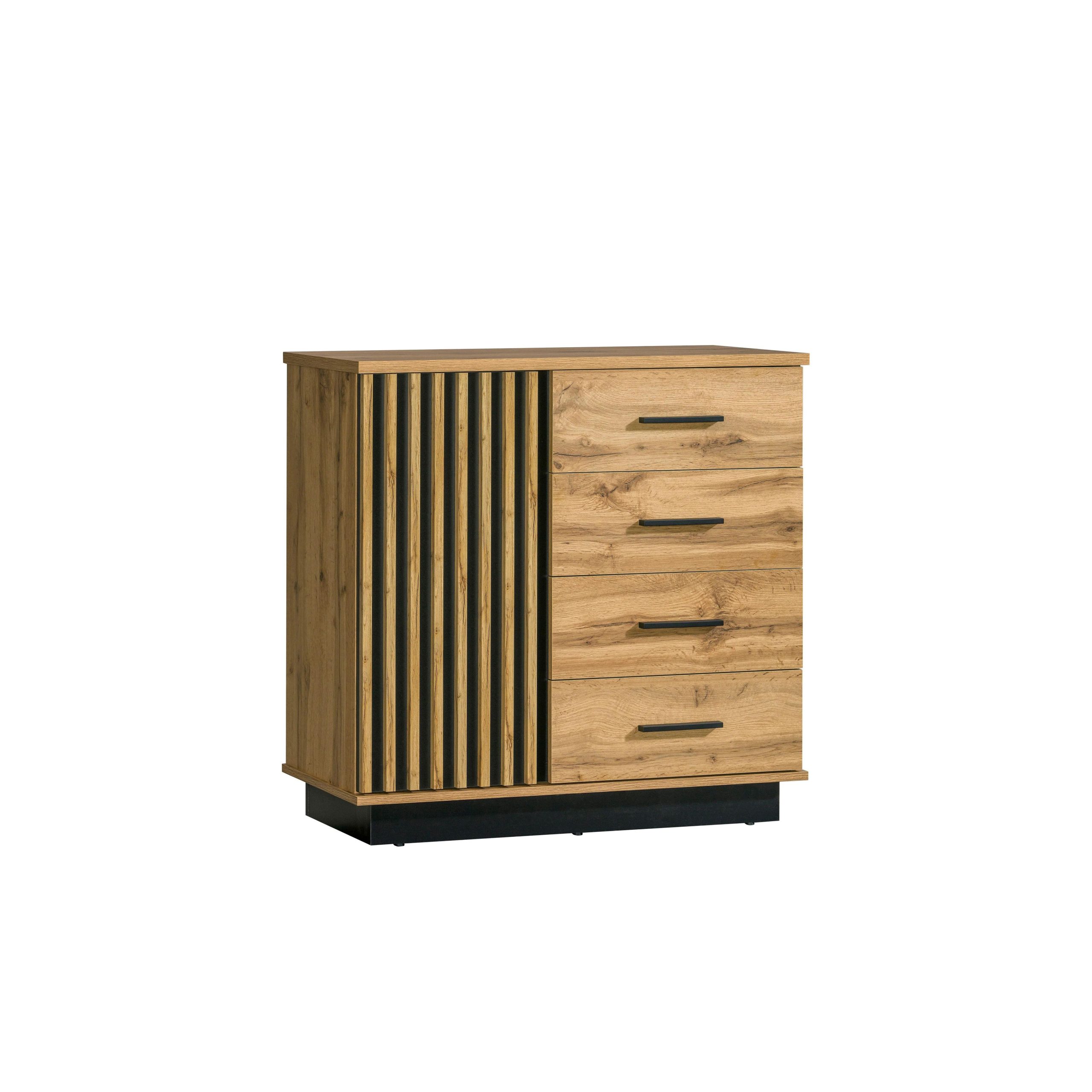 Cómoda com 1 porta e 4 gavetas. Caraterísticas principais: Estrutura em MDF. Acabamento em carvalho. Puxadores pretos. Design moderno e atual. Inclui 4 gavetas. Inclui 1 porta.
