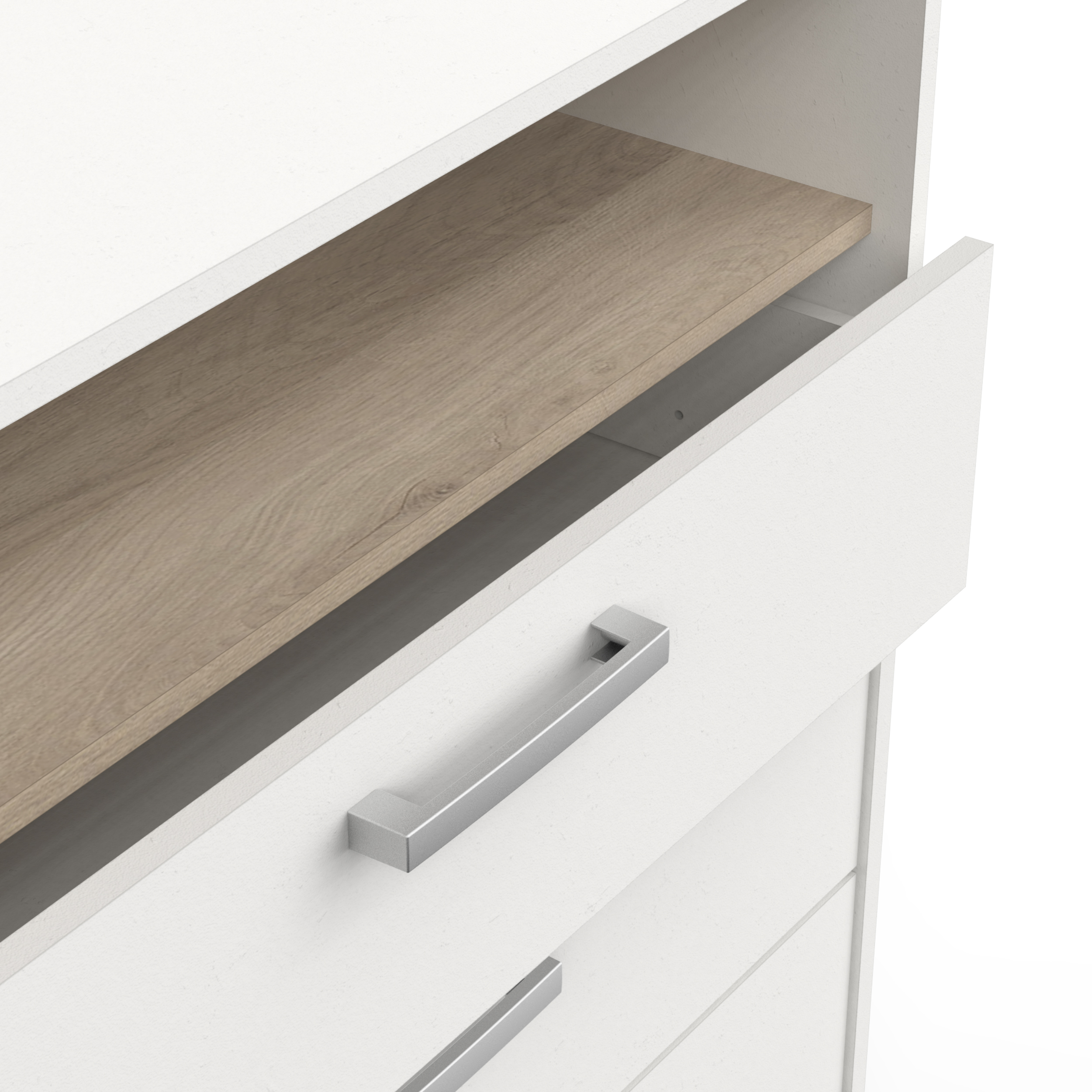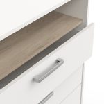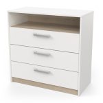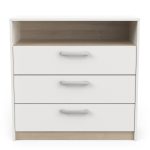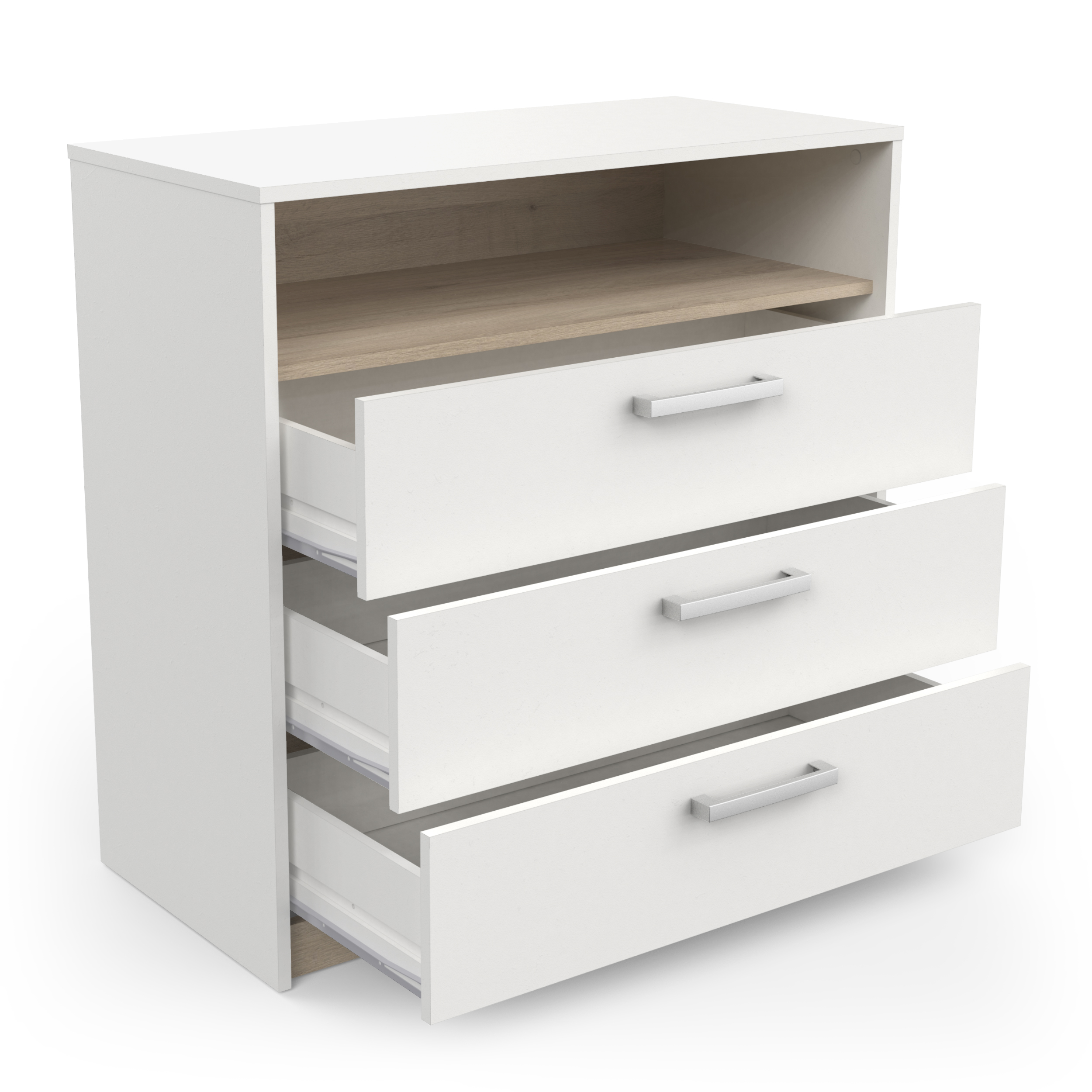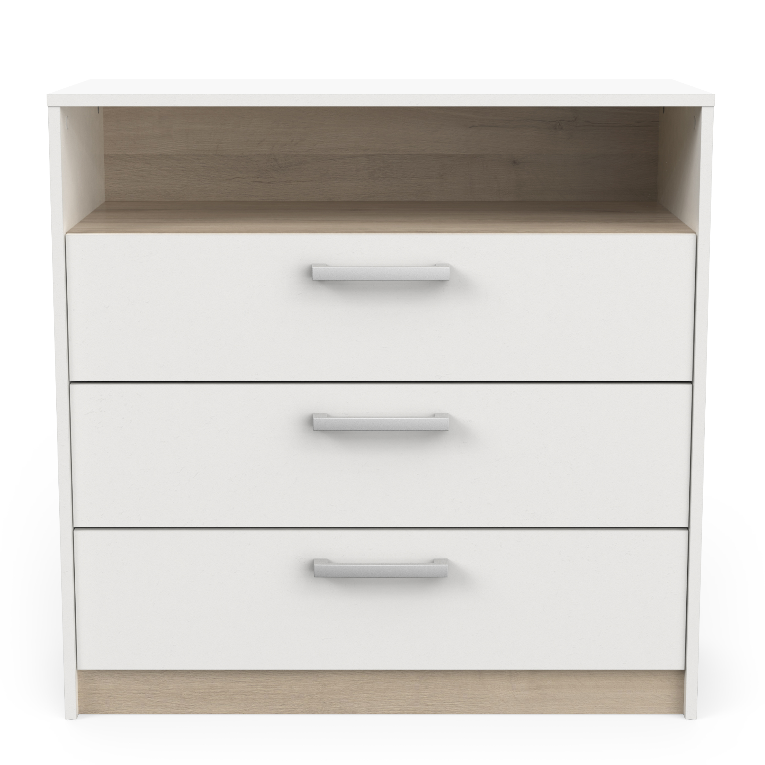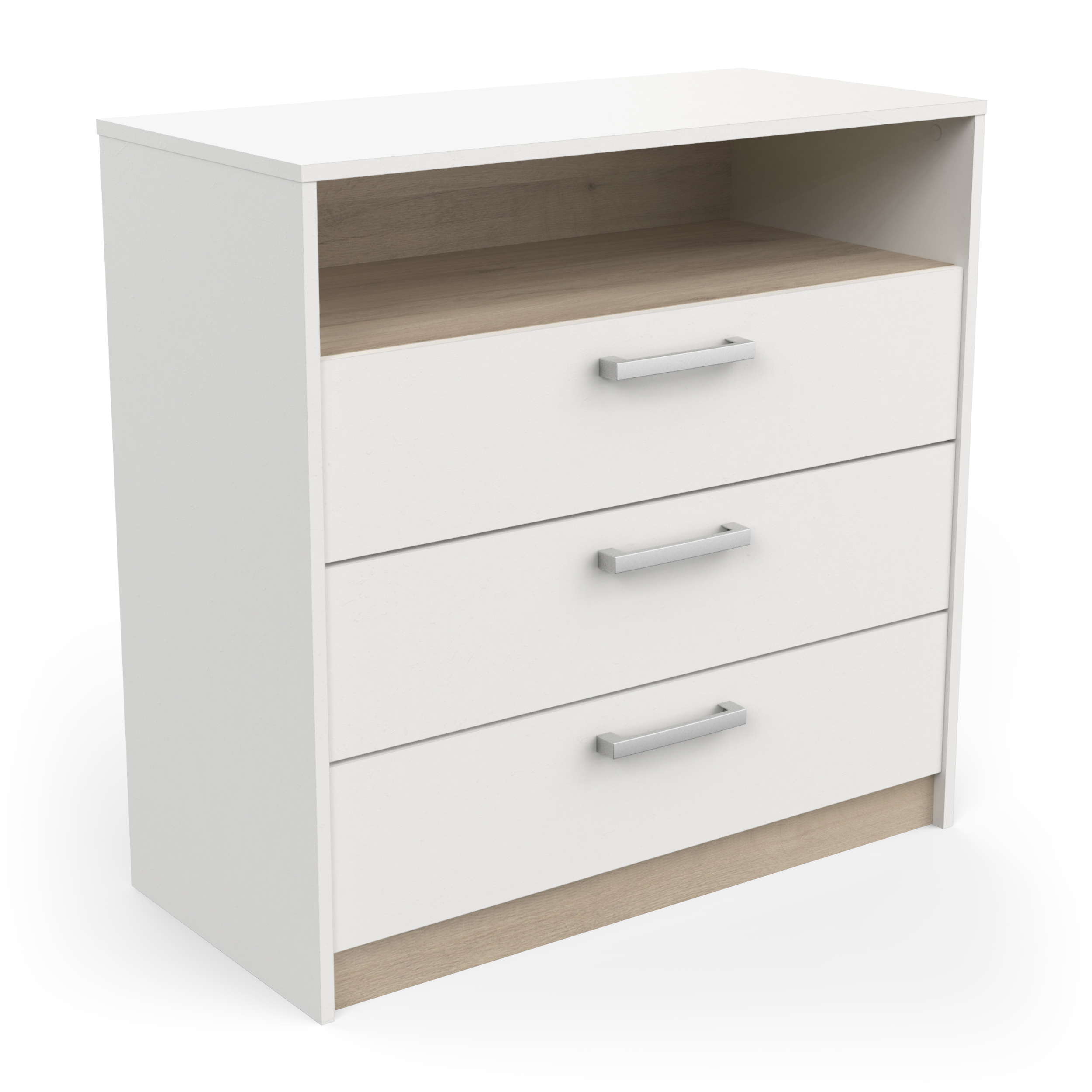 Cómoda com 3 gavetas e 1 nicho. Espírito contemporâneo realçado por um toque de madeira clara. Puxador de plástico cinzento. Grande capacidade modular de arrumação: 3 gavetas + 1 nicho.