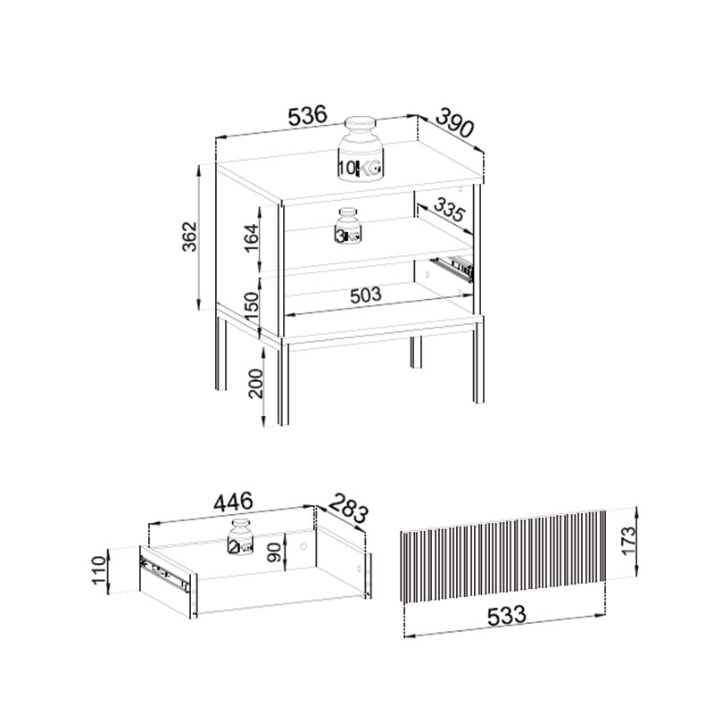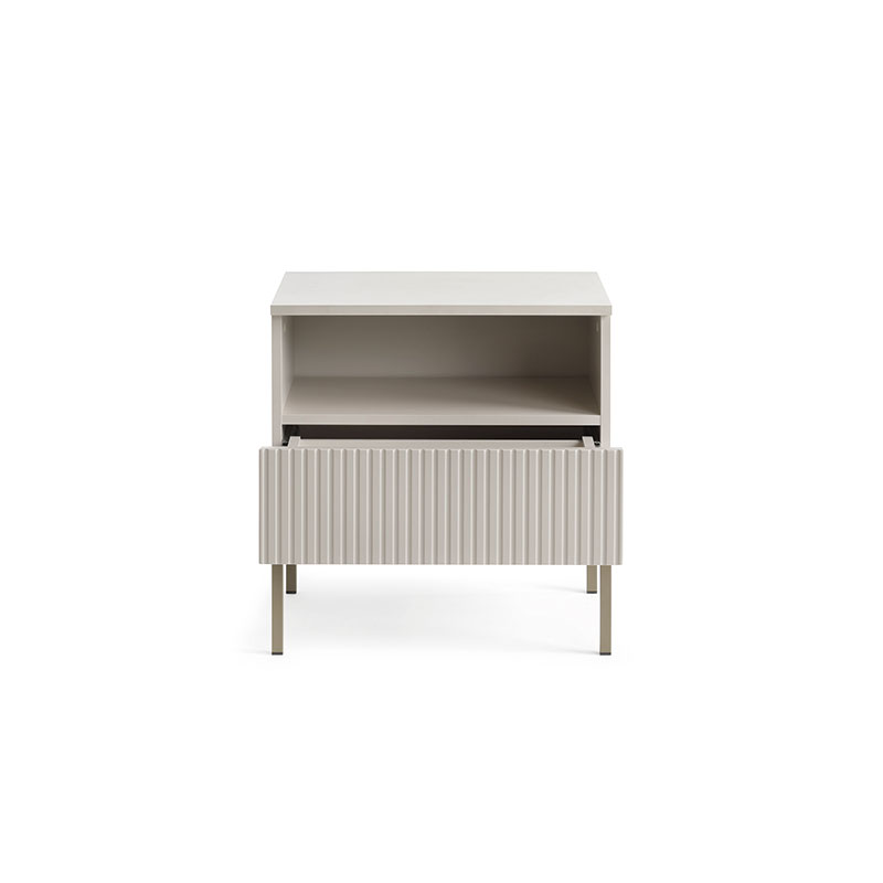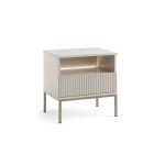 Mesa de Cabeceira com 1 prateleira e 1 gaveta, com sistema push-to-open. Prateleira inferior aberta para arrumação extra LED incluído. Pés em metal dourado com altura de 20 cm. Estrutura em melamina de alta qualidade
