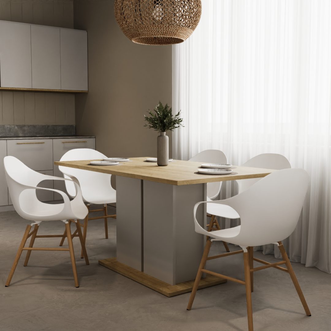 Uma mesa discreta com encanto industrial e inovador, com ar sóbrio e intemporal, coberta por tons neutros e robusto com pés metálicos. Uma peça funcional capaz de encaixar em qualquer divisão.