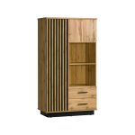 Móvel de apoio com 2 portas, 2 nichos e 2 gavetas. Características principais: Estrutura robusta em MDF com acabamento em carvalho e preto. Composto por 2 portas, 2 gavetas e 3 prateleiras interiores ajustáveis. Puxadores em preto para um toque moderno. Detalhe em painel ripado que confere textura e sofisticação. Design vertical que otimiza o uso de espaços reduzidos.