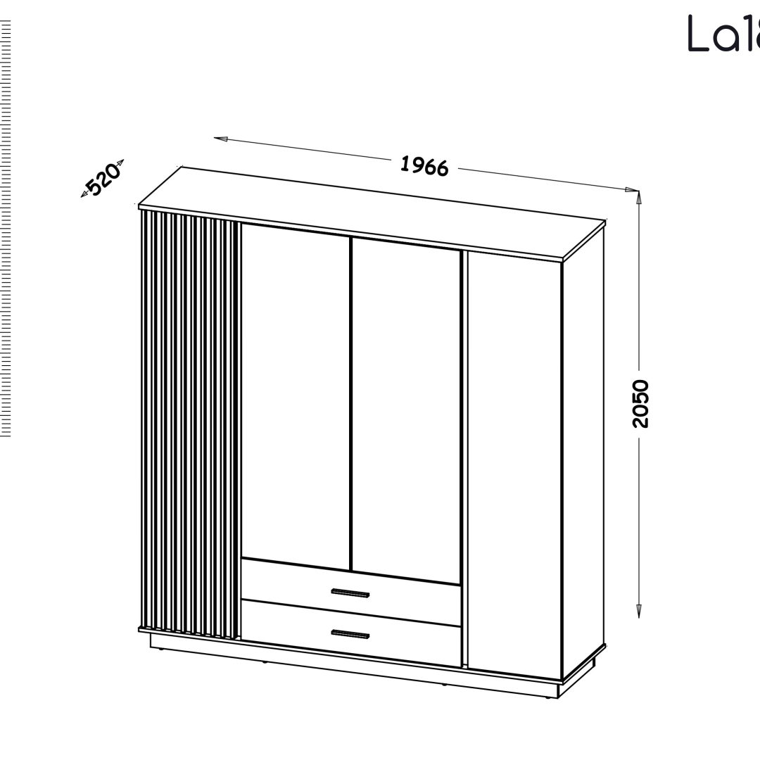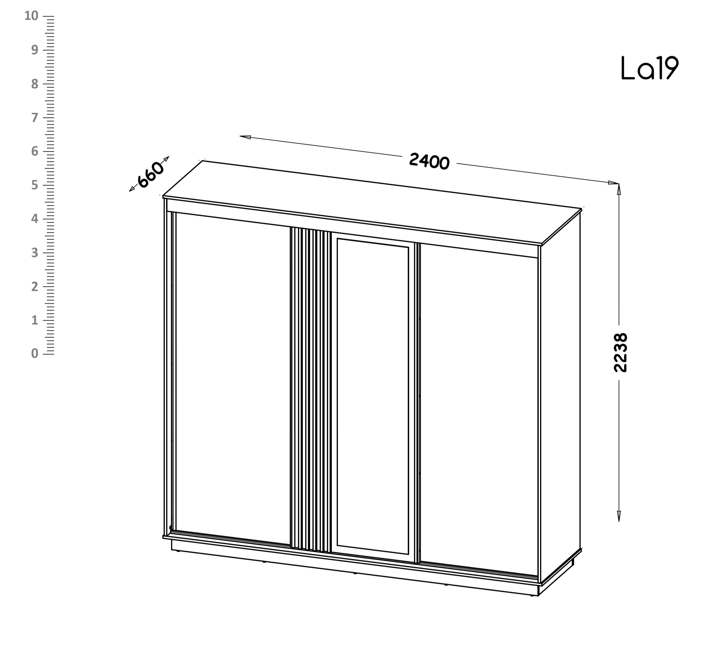 Roupeiro com 3 portas deslizantes, uma delas com espelho. Interior: 1/3 com prateleiras, 1/3 com 2 varões, 1/3 com prateleiras.