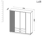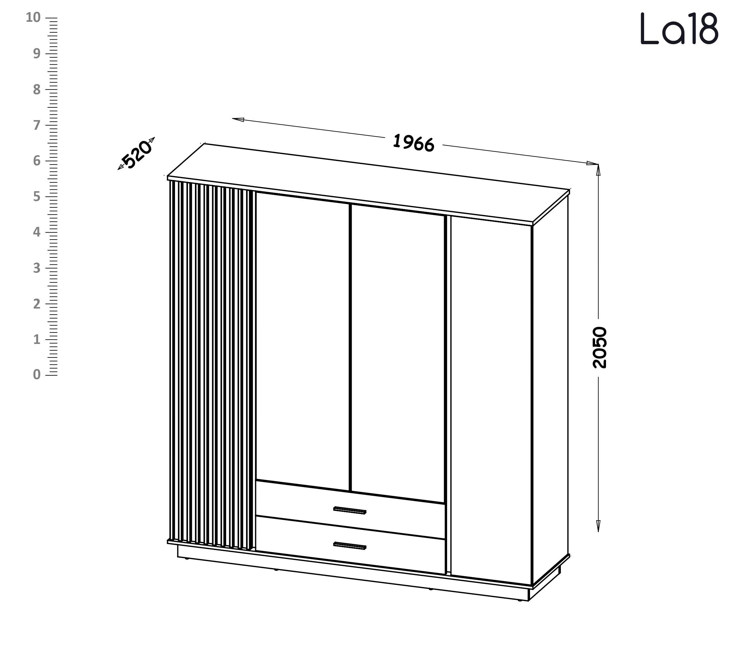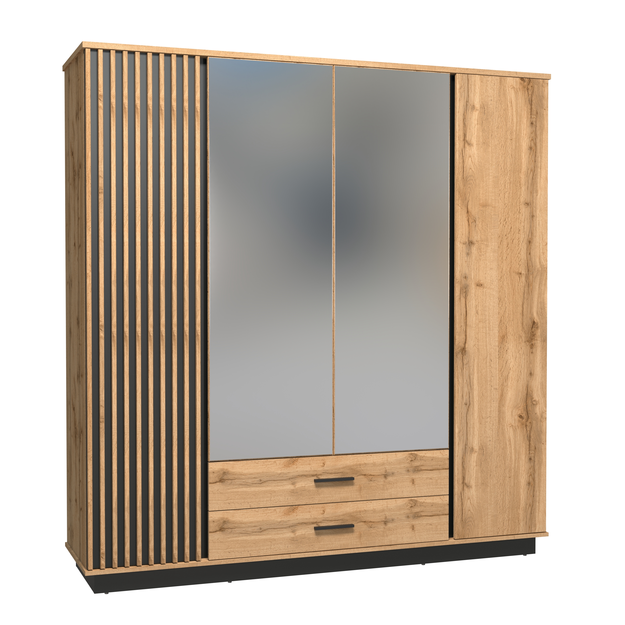 Roupeiro com 4 portas, duas delas com espelho e 2 gavetas. Interior: 2/4 com 1 prateleira e 1 varão, 2/4 com prateleiras.