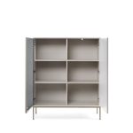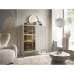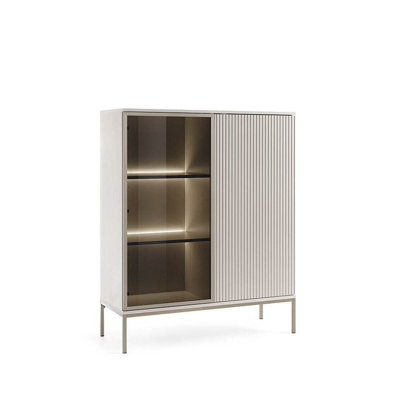 Com linhas suaves e estética minimalista, a vitrina baixa Sento traz leveza e modernidade à decoração. A combinação entre a estrutura cashmere e os pés em metal dourado transmite um visual escandinavo elegante e funcional. Composta por: 2 portas com sistema de abertura push-to-open, 1 porta com vidro temperado transparente e prateleiras interiores para arrumação visível e discreta. Estrutura em aglomerado de madeira com acabamento melamínico. Pés em metal dourados. LED incluído.